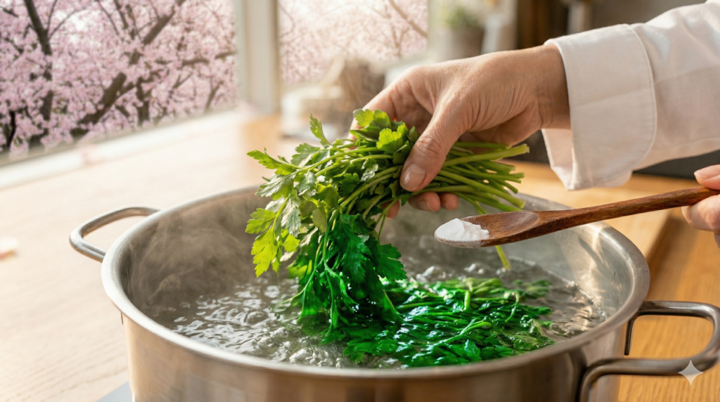 - 비법: 나물을 데칠 때 소금 대신 **’베이킹소다’**를 아주 조금(한 꼬집) 넣어보세요.